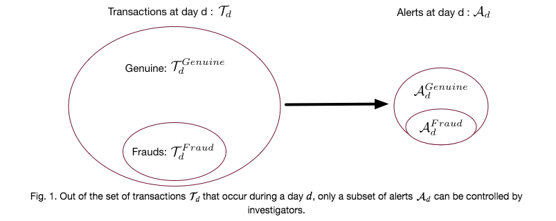 Formalmente, para um dia , vamos denotar por o conjunto de transações. Apenas uma minoria de transações é fraudulenta, enquanto a maioria é legítima. Vamos ainda denotar por o conjunto de alertas. O conjunto de alertas contém tanto verdadeiros positivos () quanto falsos positivos (). A Fig. 1 fornece uma ilustração esquemática.